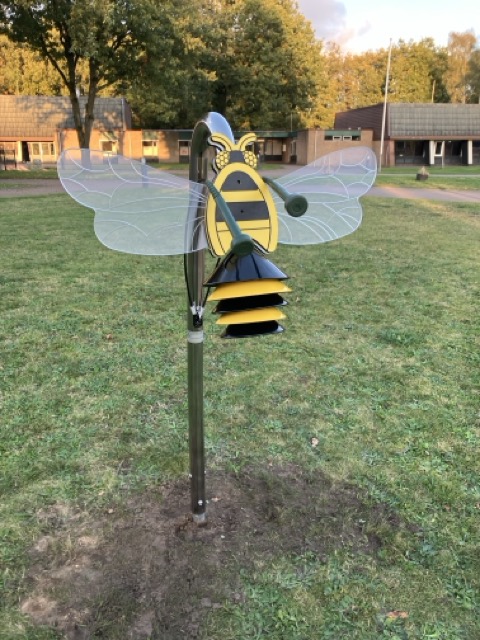 Deze muziekhommel staat langs het pad aan de Brink-zijde van het hoofdgebouw van de Trans. Door met het stokje op de onderkant van het lijfje te slaan, krijg je mooie pentatonische klanken te horen.
